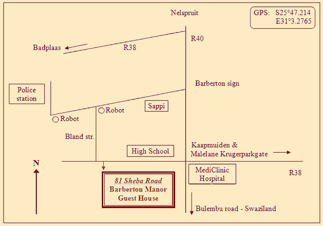 * After 1.500 m, (you will pass the High School), Barberton Manor Guest House**** is at your left. |